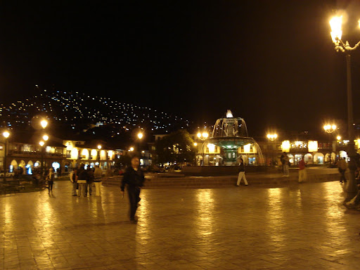 我們當晚到Cusco酷斯科市區用餐並來個夜遊酷斯科,酷斯科的中心是Plaza De Armas (Army Square)。這裡真的擺脫秘魯其他小裡小氣的城市,寬闊的廣場周圍盡是些壯麗的教堂(大概有個4~5座吧!),很歐式的感覺!很美!而我們住在酷斯科旁的山坡上,因此還可以將夜景近收眼底!!