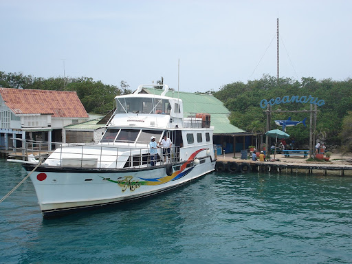 Islas del Rosario(羅薩利歐島),以他的珊瑚礁地形以及水族館聞名。珊瑚礁島,去除了混著的泥沙,讓島周圍的海水清澈見底。才一下船,兩旁販賣小龍蝦料理的小販便開始叫賣,積極地推銷生鮮料理。一隻小龍蝦要價200圓台幣!我們不是這個奢侈的人,不會受這些雕蟲小蝦的誘惑的!(其實是怕拉肚子!)